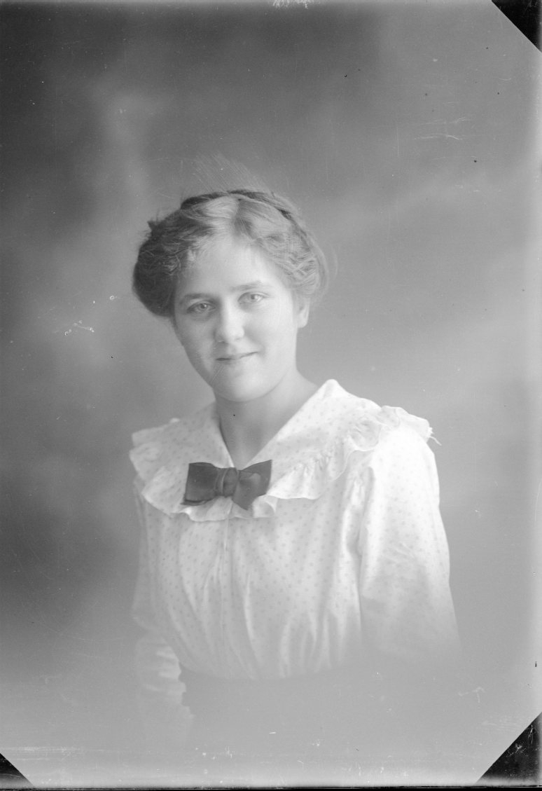 Porträtt av en ung kvinna, i prickig blus och svart rosett vid halsen.
