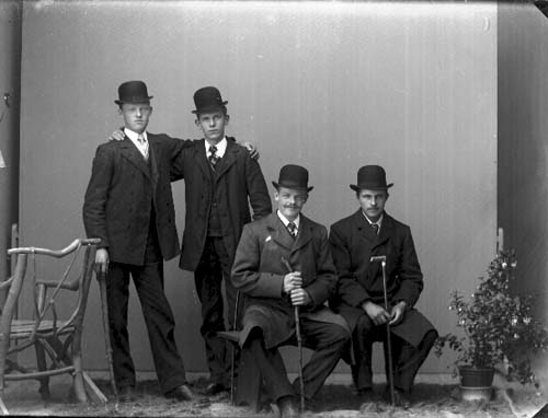 Gruppbild med fyra män/pojkar med hatt och spatserkäpp. De yngre står med armen på varandras skuldra och de äldre sitter ner. En av dem är Karl Ekblad.