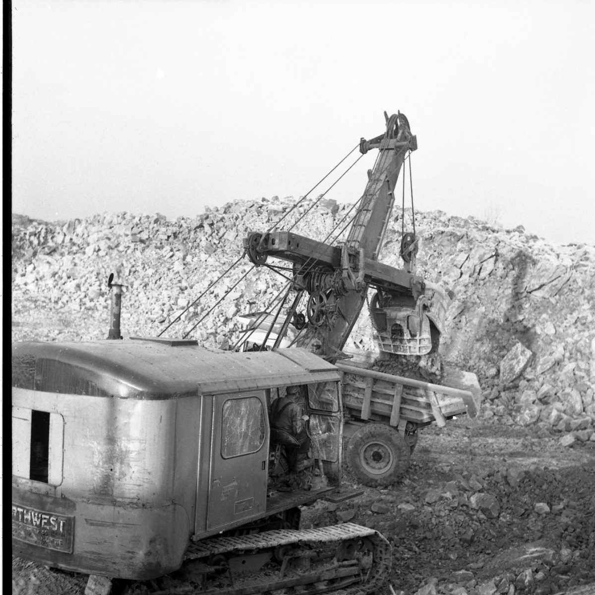 Bergrensning. En arbetare sitter i en grävmaskin som lastar upp bergrester på ett flak.