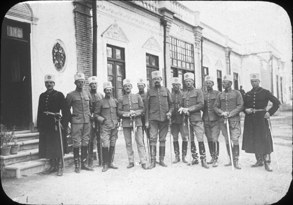 "Svenska officerare i Teheran i februari 1912 - Persergeneralen [Hjalmarsson] i midten." Hjalmarsson som nr 7 fr och därnäst troligen Norén-Brandel samt Borell som nr 9 och 10.