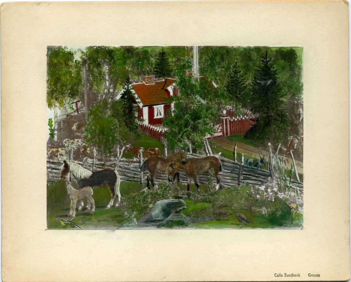 Fotografi av Fredrik Hård af Segerstads diorama med skulpterade figurer från livet på landet i Reaby: "Biologi i skulptur". I dioramat syns bland annat hästar, fåglar och fjäderfä. Färglagt fotografi.