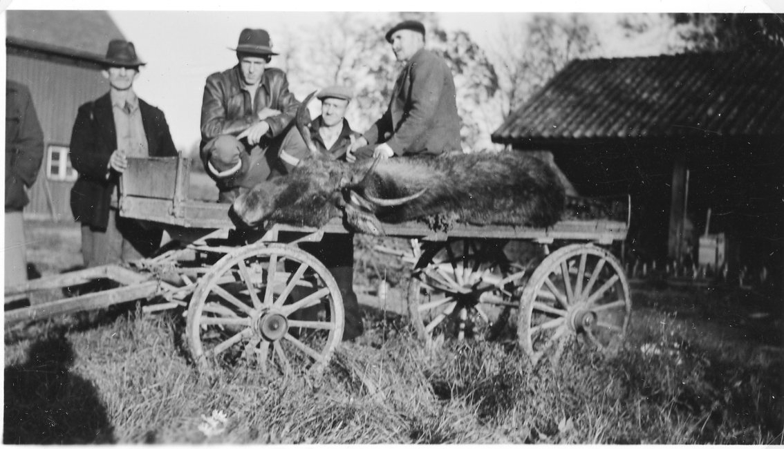 En skjuten älgtjur ligger på en arbetsvagn. Män sitter på densamma respektive står runtomkring.