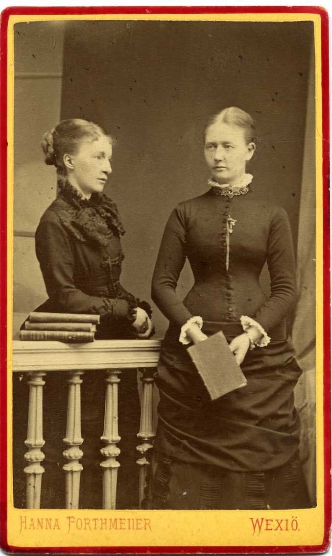 Två unga kvinnor står vid ett räcke i en ateljé. Det ligger böcker på räcket och kvinnan till höger håller en bok i händerna.