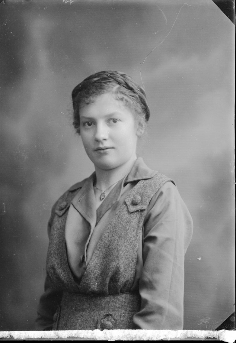 Porträtt av en flicka i övre tonåren som sitter på en pinnstol.