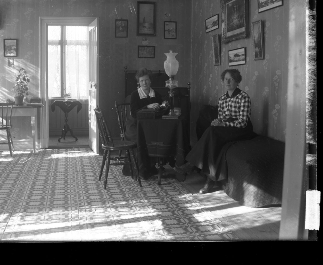 Två kvinnor sitter vid ett bord med en hög fotogenlampa. Solen skiner in från vänster.