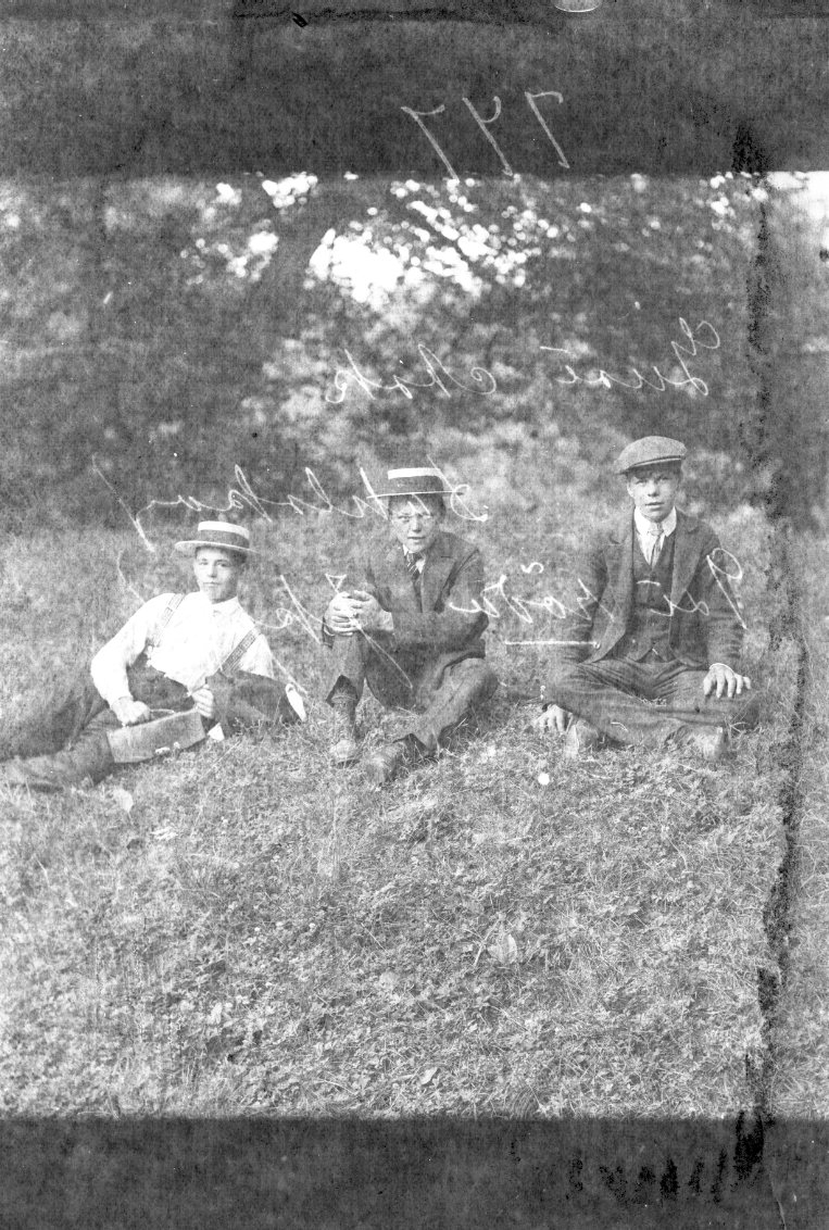 Tre unga män i hatt sitter och ligger i en grässlänt, sannolikt i närheten av Visingsborgs slottsruin. Mannen till vänser har tagit av sig kavajen. Han har hängslen i byxorna.