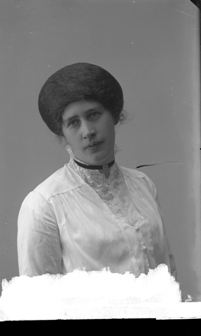 Porträtt av en ung kvinna med en rund hatt på huvudet.