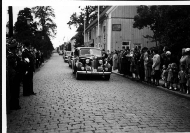 En bilkortege utanför Hotell Brahe i Gränna. I första bilen sannolikt kung Gustaf VI Adolf. Foto i samband med Eriksgata.