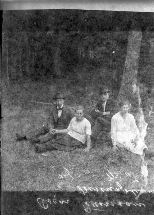 Två män och två kvinnor sitter i gräset intill ett träd. Det yngre paret håller varandras hand.