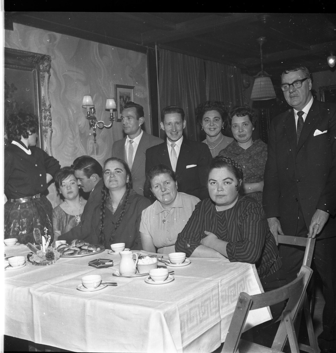 Kvinnor och män vid bord dukade med kaffekoppar. Det är Rifas personalfest (?) på Ribbagården. Kvinna i ljust är Birgit Karlsson och bakom henne står Josef Karlsson.
