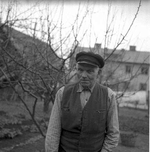 En äldre man står och ser in i kamerna. Han är iklädd skjorta och väst. På huvudet bär han en skärmmössa. I bakgrunden kan man skymta en trädgård med träd och grönsaksodling.