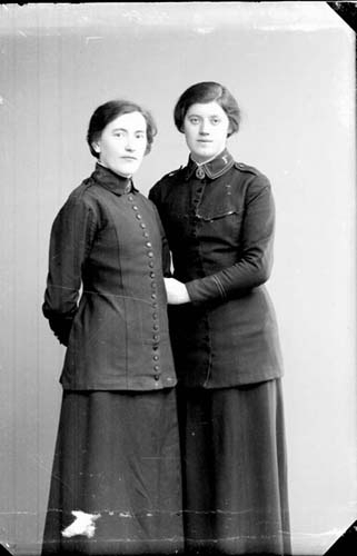 Två unga kvinnor i frälsningsarméns uniform står intill varandra.