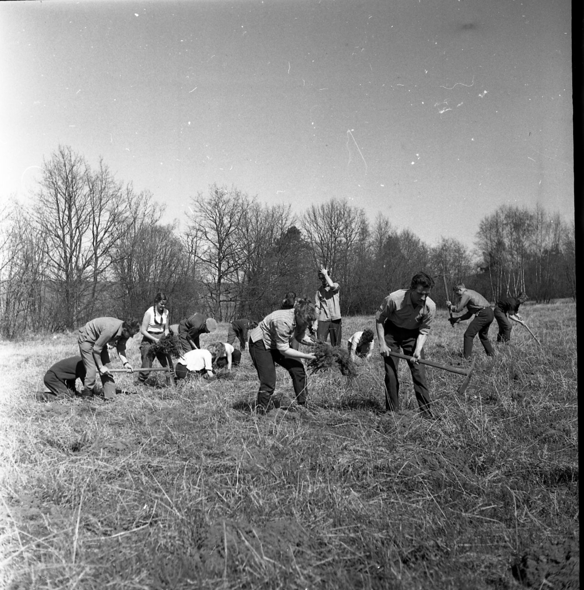 Skogsplantering på Röttles raster april 1961. Flera personer står med hackor och gör hål i marken. Några sitter på huk och planterar träd.