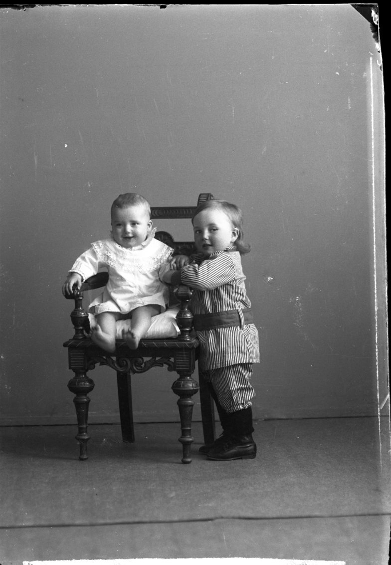 Porträtt av två små barn, den minsta sitter i en stol.