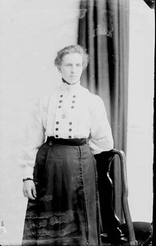 Porträtt av en ung kvinna i ljus blus med dubbla knapprader och mörk klänning.