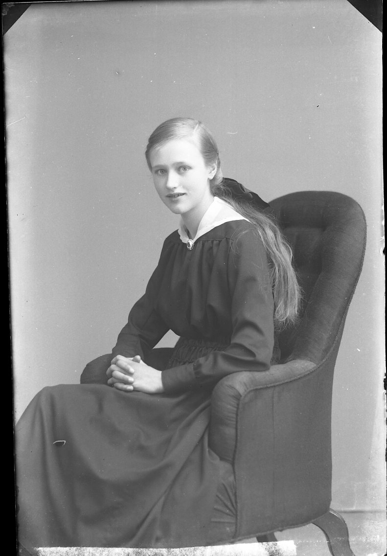 Porträtt av en flicka med långt hår som sitter i en fåtölj.