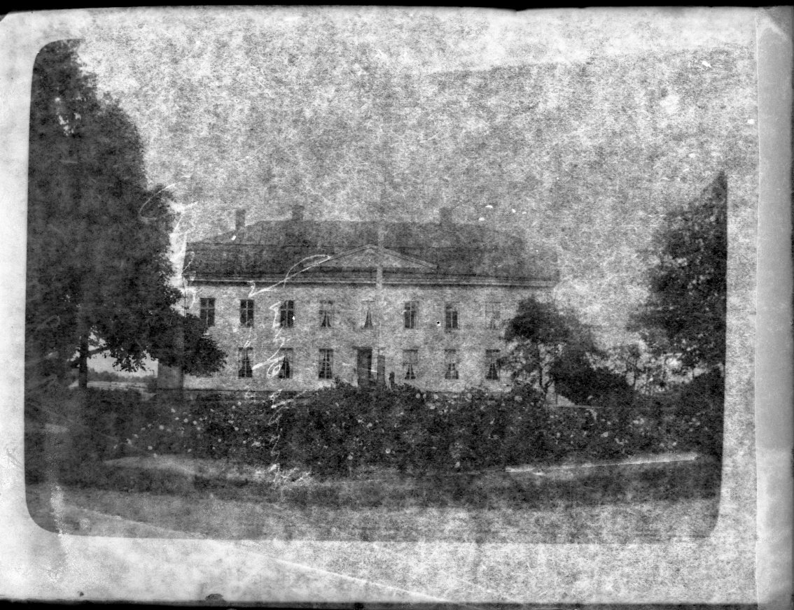 En större tvåvåningsbyggnad med valmak tak. En flaggstång på gårdsplan framför.
