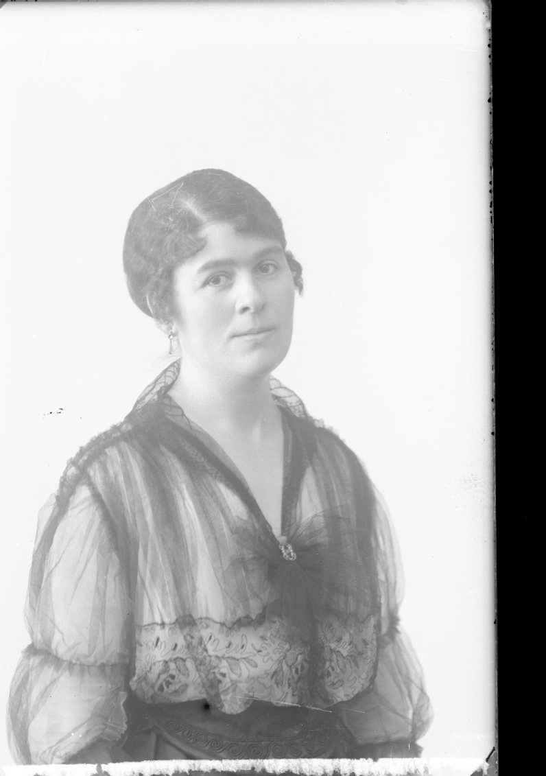 Bröstbild av en kvinna. En tunn, gles drapering över axlarna.