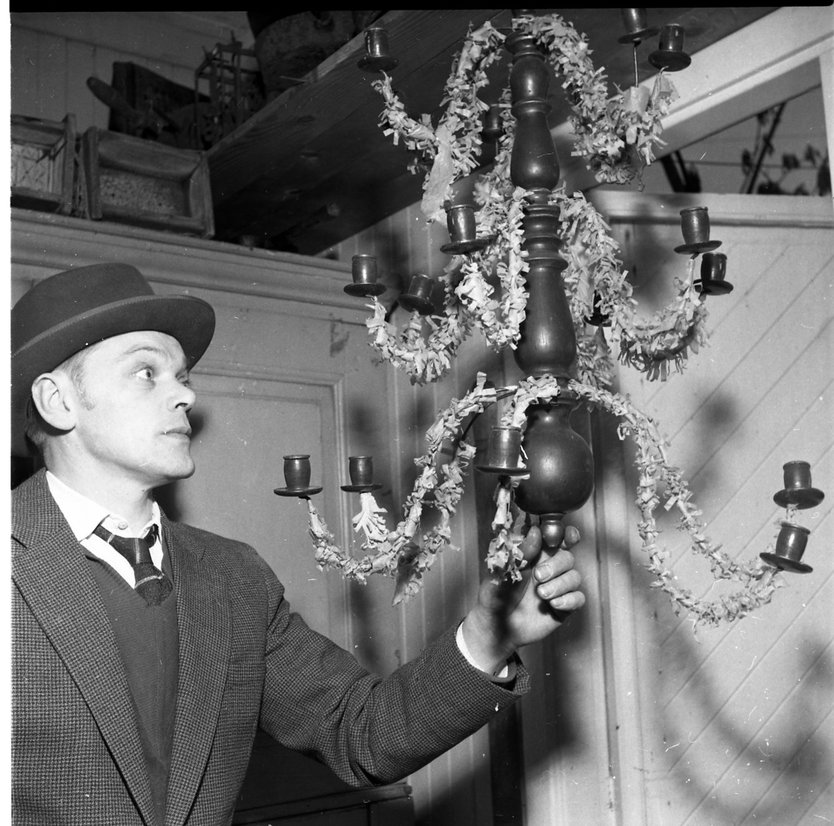 En man med hatt står vid en upphängd med fransat papper dekorerad ljuskrona.
