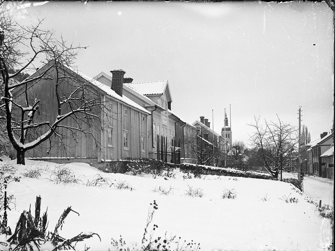Brahegatan vintertid med snö på förgårdarna till kvarteren Holländaren 3-4 och Ångbåten 1.
