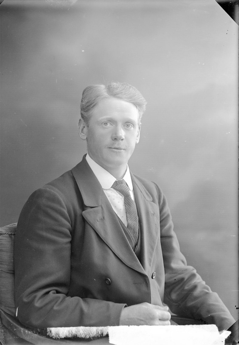Porträtt av en sittande ung man, med slips och prickig skjorta.