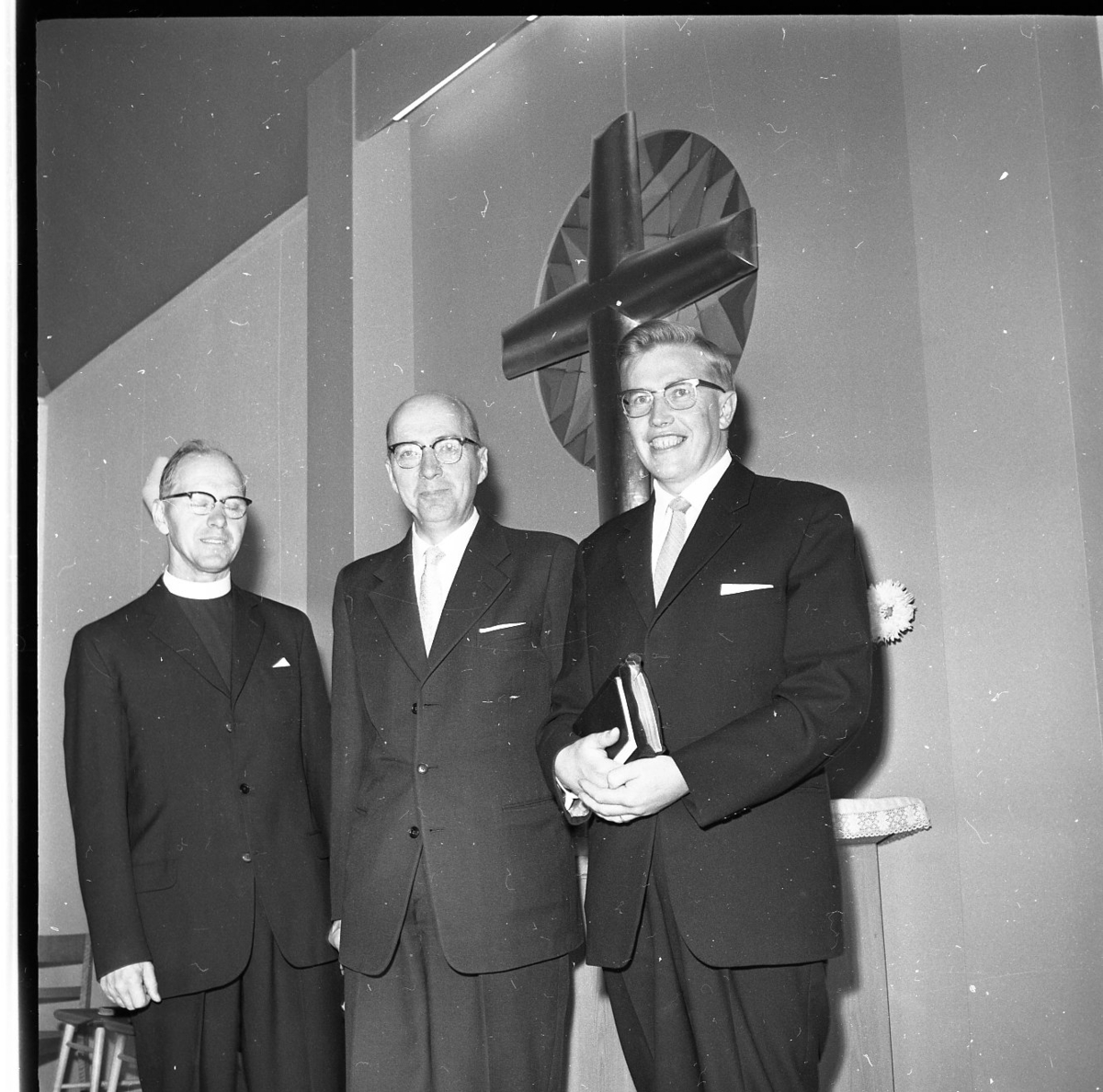 Tre män står uppställda för fotografering framför ett altare. De ler brett.