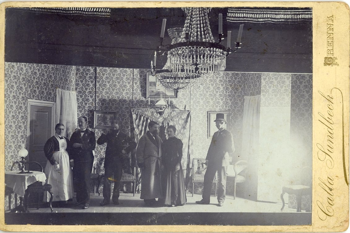 Kabinettsfotografi av en tablå? Tjänstefolk till vänster, ett herrskap i mitten - mannen i morgonrock - en man med hög hatt till höger.