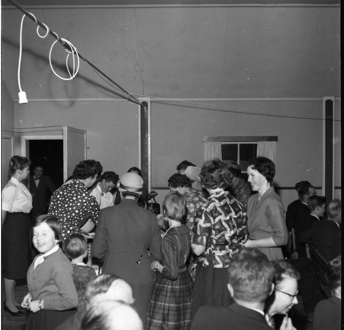 En grupp kvinnor står och tar för sig av fika vid ett bord.
