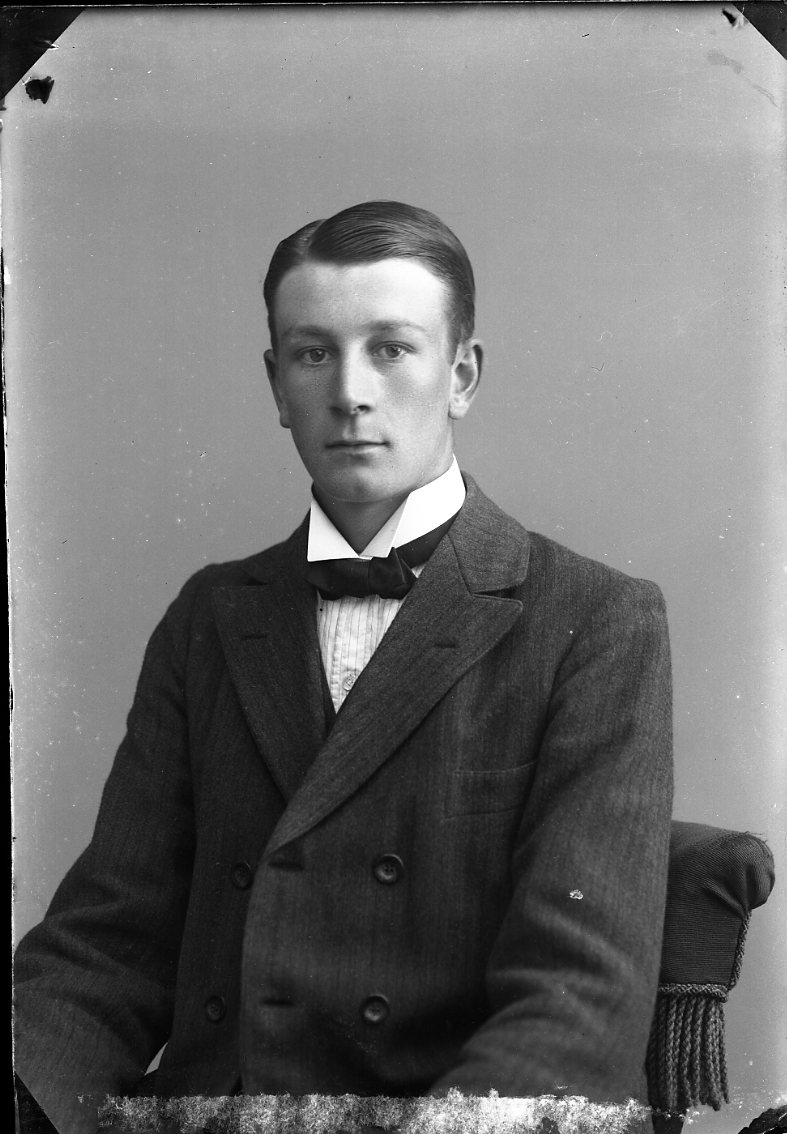 Porträtt av en ung man som sitter på en stol. Bröstbild.