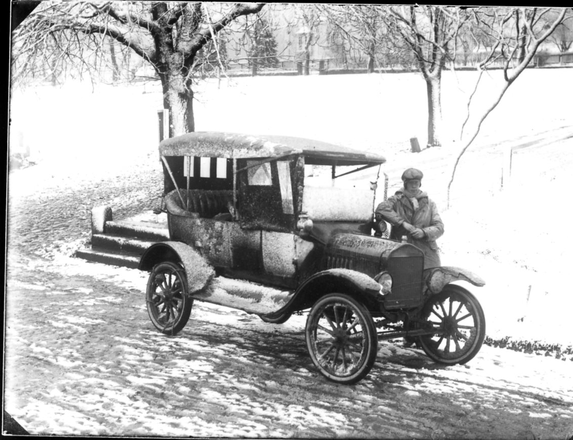 En nedisad bil står på Brahegatan i Gränna vid torgets södra uppfart. En man i rock, halsduk och mössa med öronlappar står på andra sidan bilen, lutad mot densamma. Han har en liten snöhög på mössan.