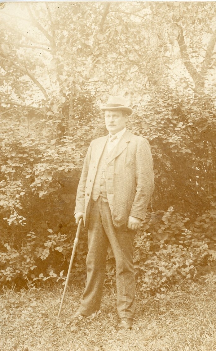 Fotografi av en okänd man med hatt och spatserkäpp. Han står i en trädgård. Vykort.