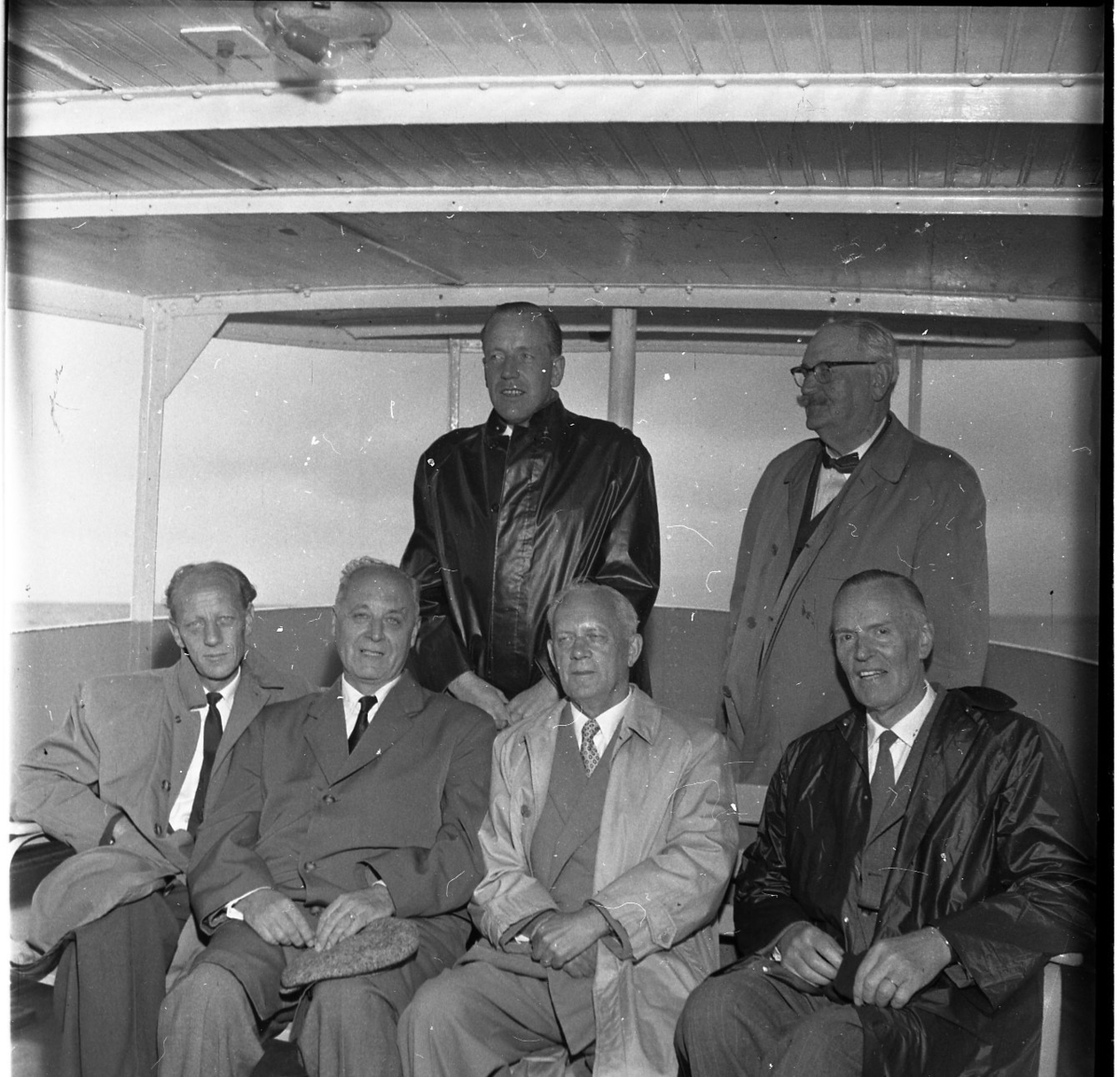 Sex herrar i aktern på en båt. Fyra sitter och två står bakom resterande. Alla ser in i kameran och ler. A E Bolling står till höger.