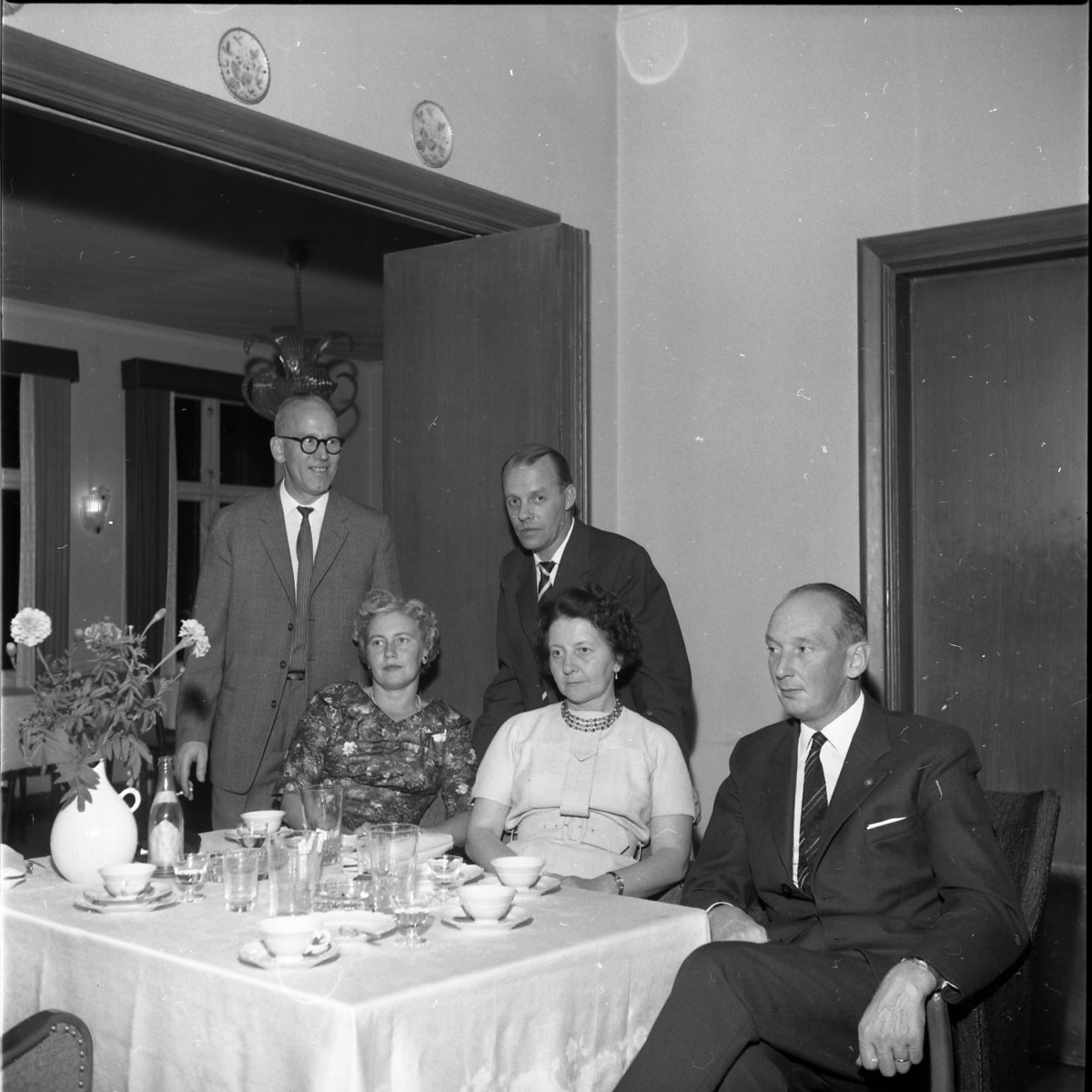 Ett sällskap bestående av två kvinnor och tre män befinner sig vid ett middagsbord. På bordet ligger en vit duk och kaffekoppar står uppdukade.