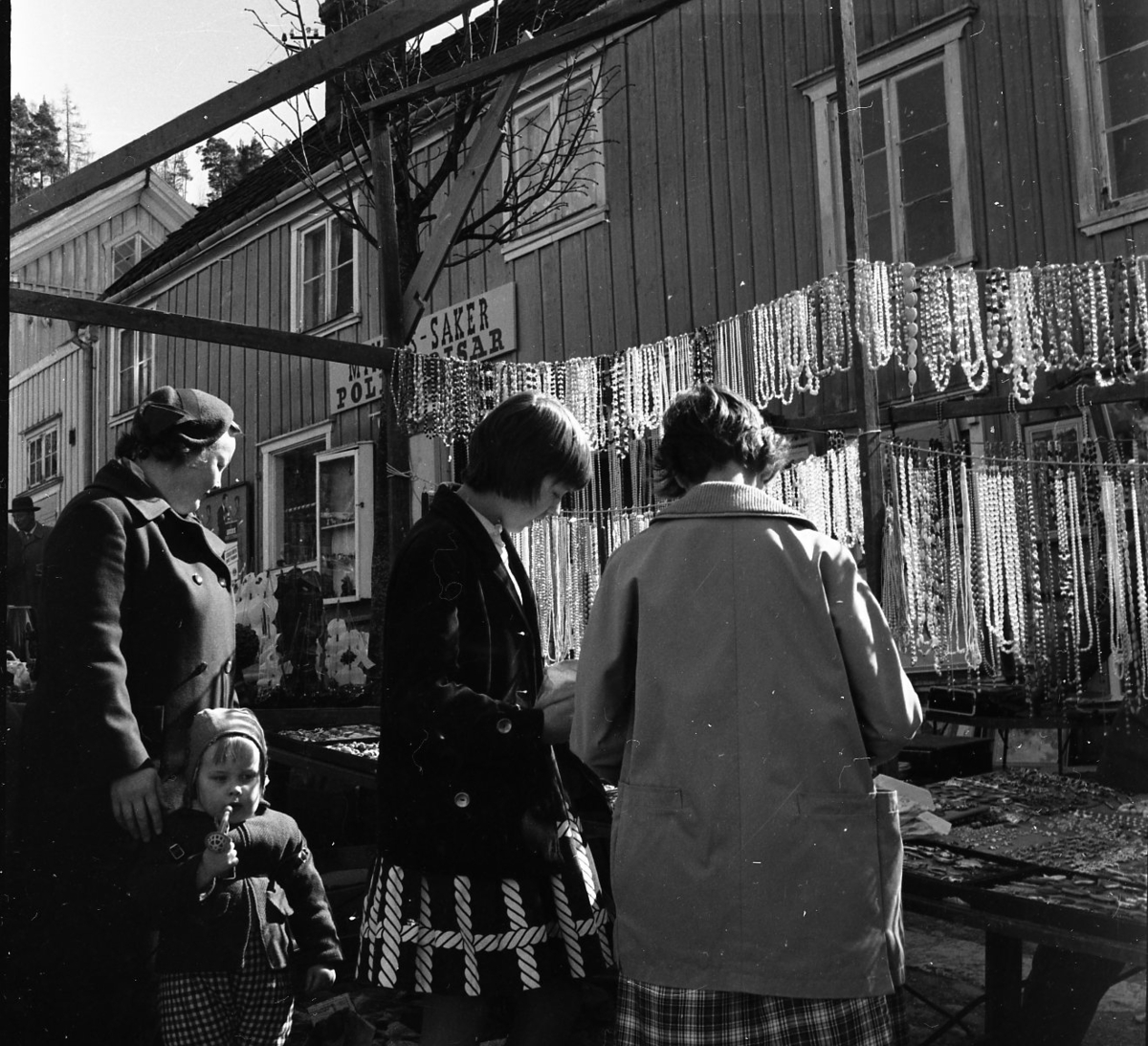 Två flickor och en mamma med sitt barn står vid ett marknadsstånd och tittar på halsband.