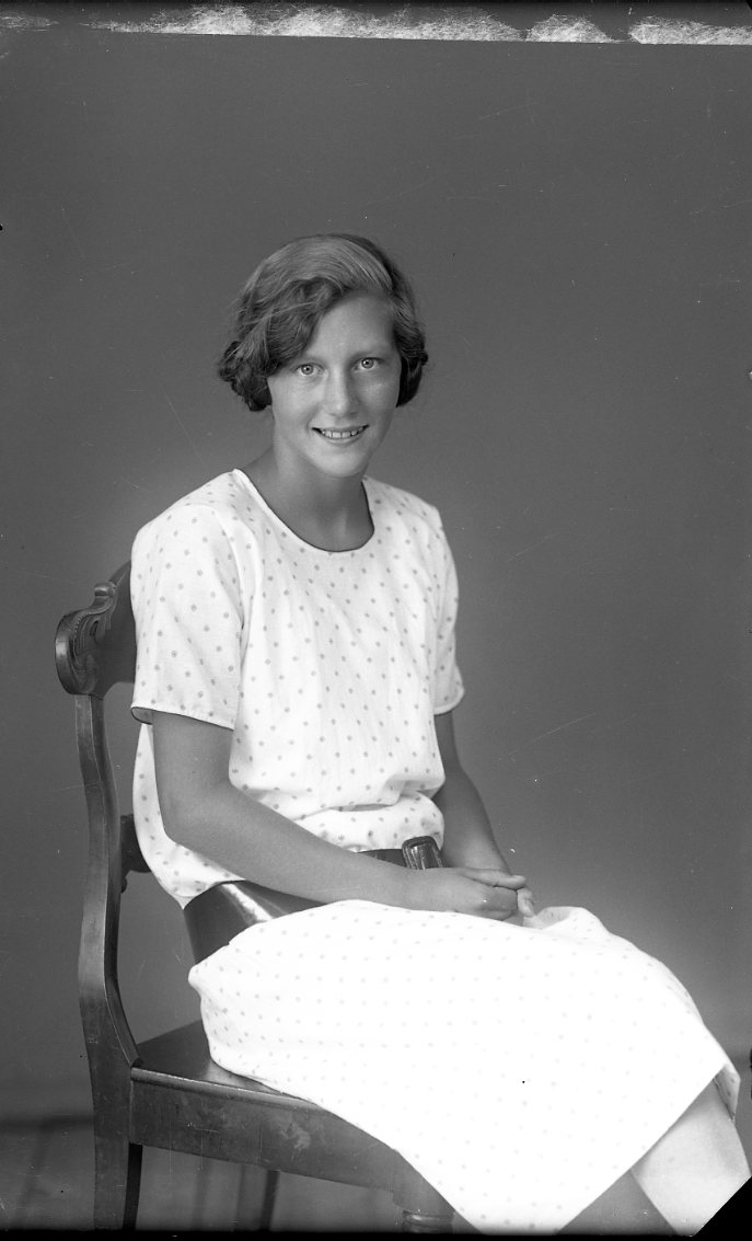 Porträtt av en flicka som sitter på en stol. Hon heter Britta eller Aurora Carlsson.