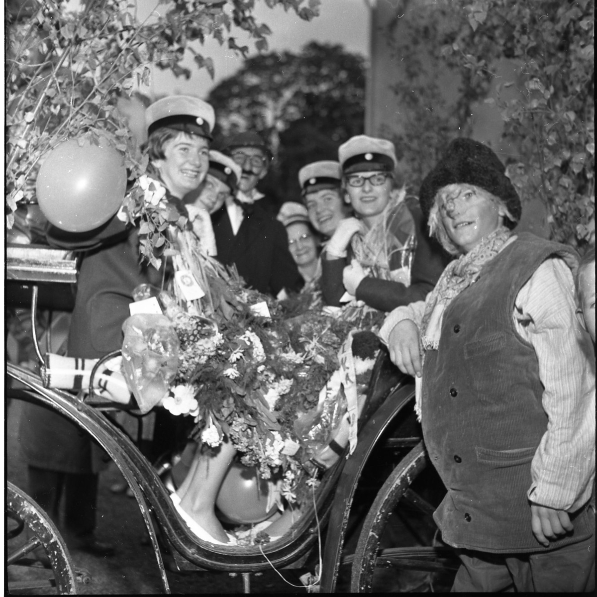 Realexamen 1961. I en hästkärra sitter flera glada kvinnliga studenter. De bär studentmössor och har buketter runt halsarna Vid sidan av hästkärran står en person utklädd till kusk. Hen bär hatt, väst och lösnäsa.