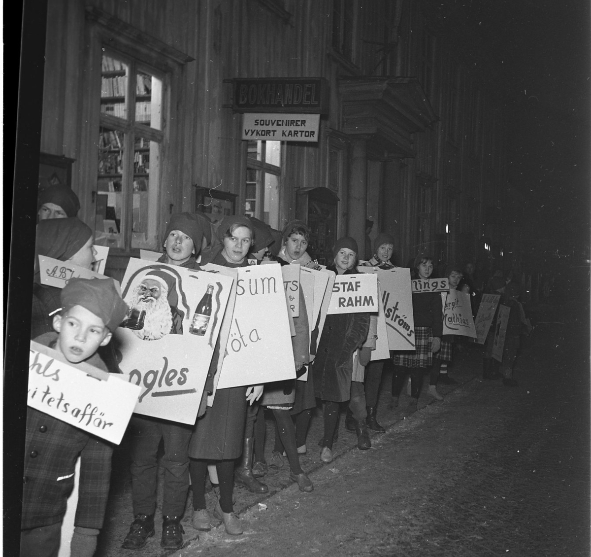 En rad med ungdomar står och köar längst med en trottoar. De bär plakat om halsarna och luvor på sina huvuden.