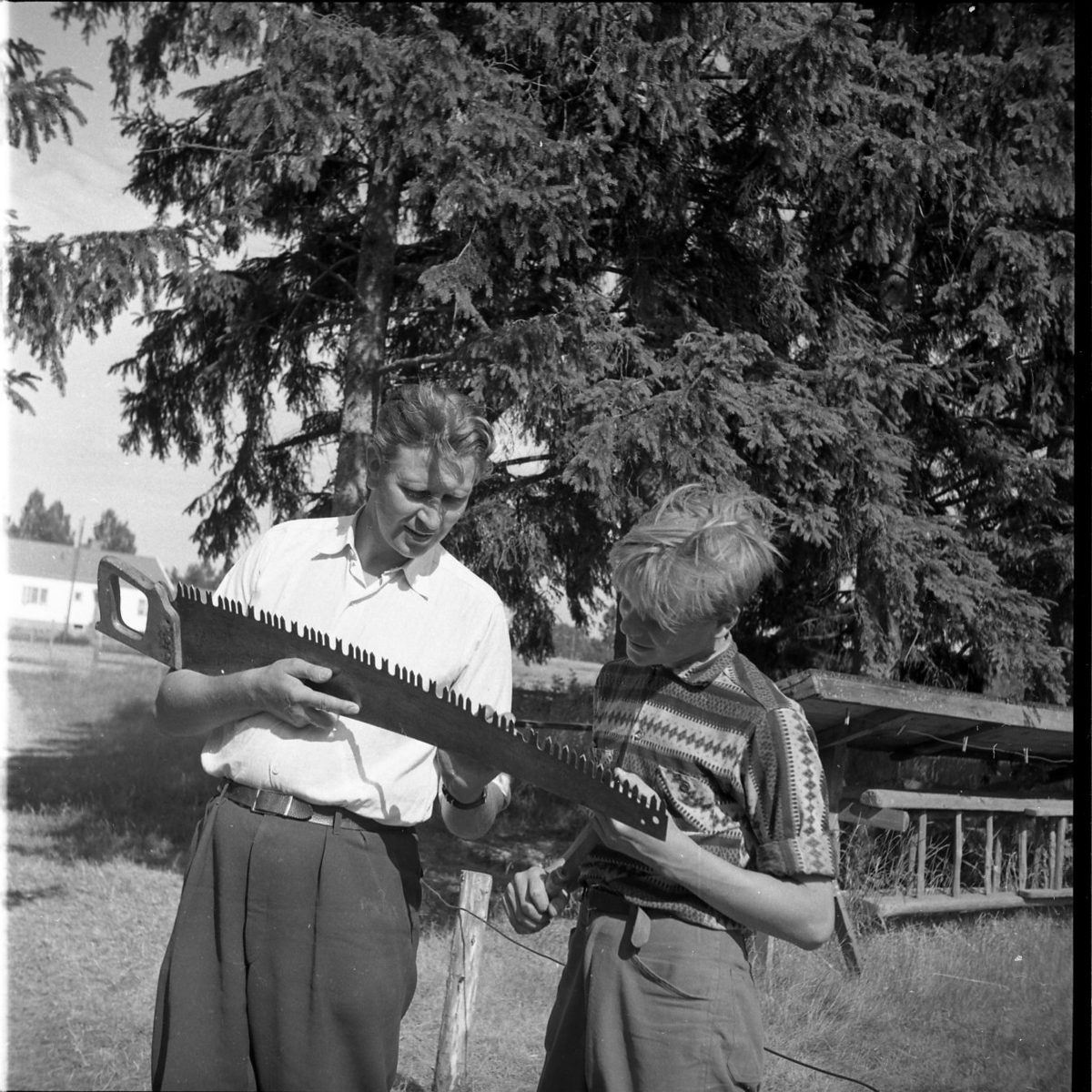 Skogvaktare Per Svensson står med en såg i famnen. Sågen är lång och har väldigt grova tänder. En yngre man står och tittar på sågen.