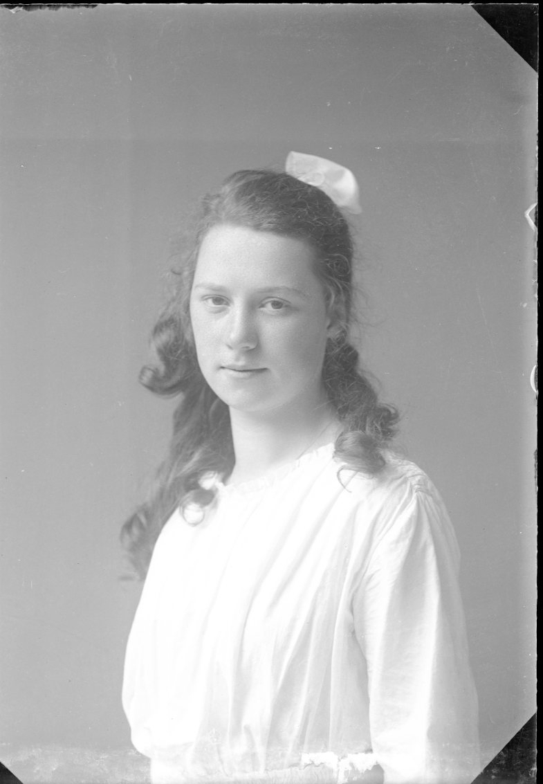 Porträtt av en flicka i tonåren. Hon har en rosett i håret.