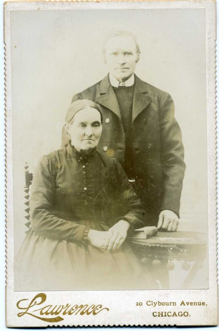 Kabinettsfotografi: en kvinna sitter bredvid en stående man.