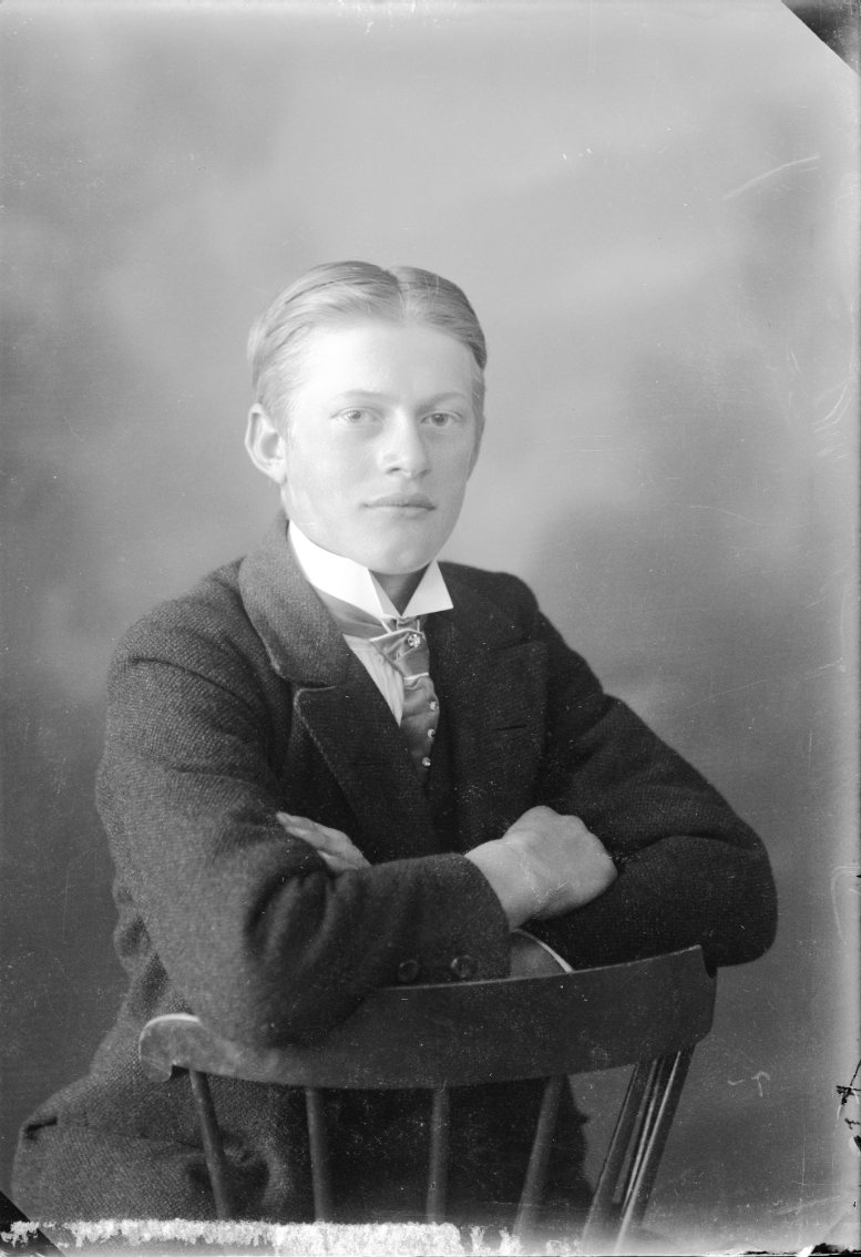 Porträtt av en pojke i tonåren. Han sitter bakvänd på en stol med armarna i kors vilande på stolsryggen.