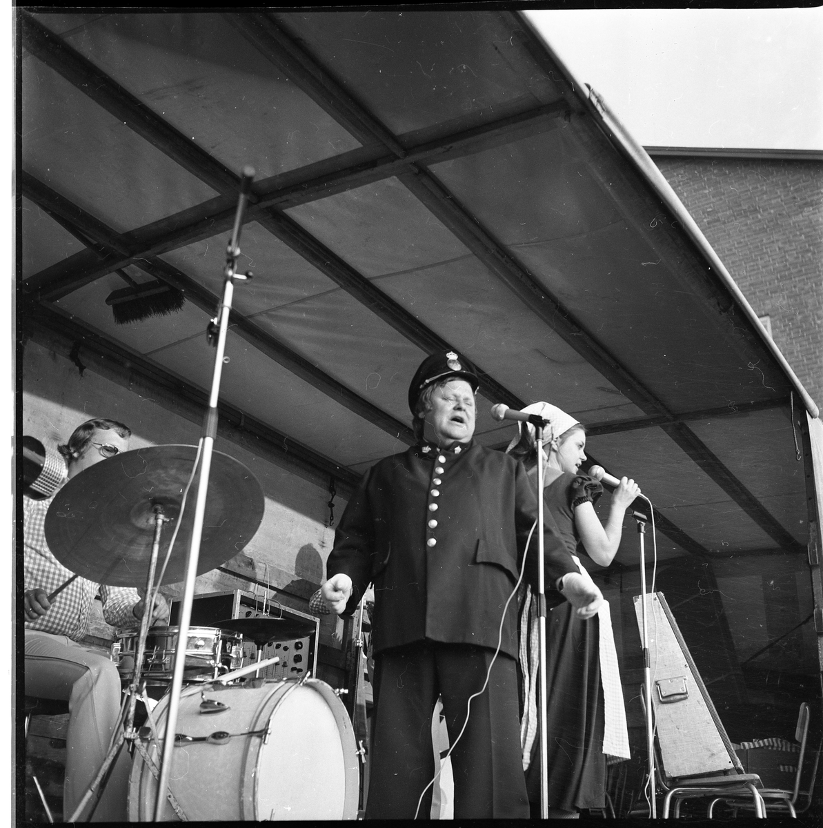 En man i uniform, skärmmössa och vita handskar och en kvinna med hätta och förkläde sjunger på en scenvagn. En liten orkester i bakgrunden.