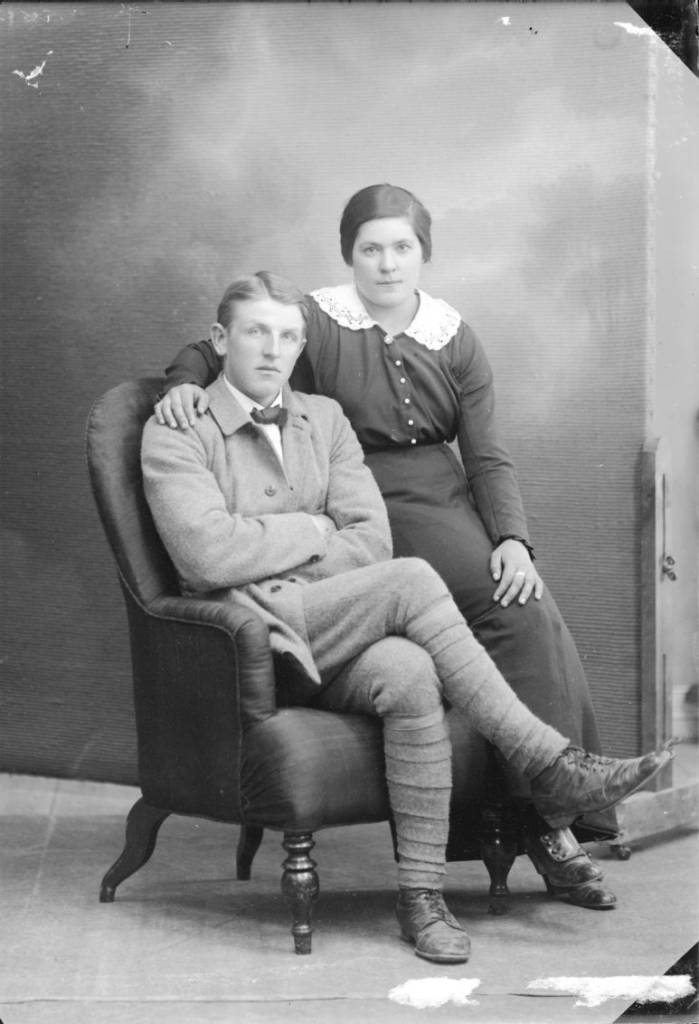 Porträtt av en ung man och kvinna. Mannen sitter i en fåtölj, kvinnan sitter intill på armstödet med armen om halsen på honom.