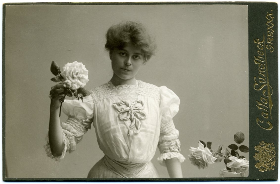 Kabinettsfotografi: en okänd ung kvinna i ljus dräkt och åtsnörd midja. Hon håller upp en ros i en hand. Bredvid henne står en vas med rosor.
