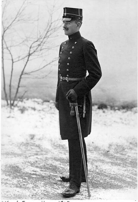 Porträtt av Carl Egnell i 3/4-profil i militär uniform och vänster handen på värjfästet. Det ligger lite snö på marken.