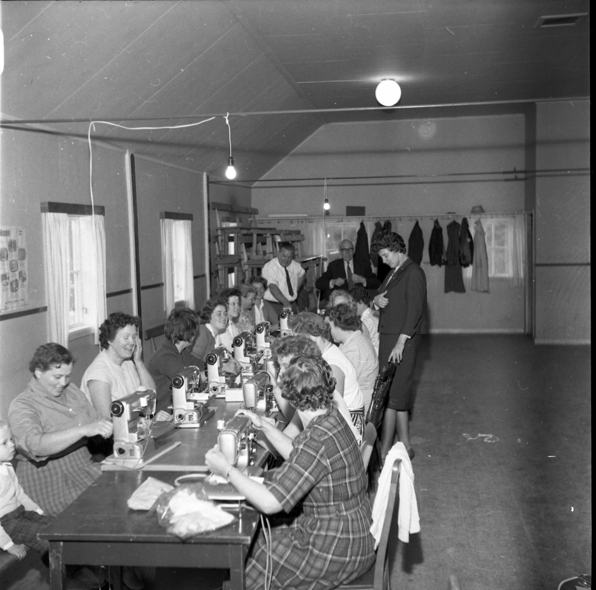 En grupp kvinnor sitter vid varsin symaskin längst med ett långbord. Två män står och tittar på kvinnorna när de syr.
