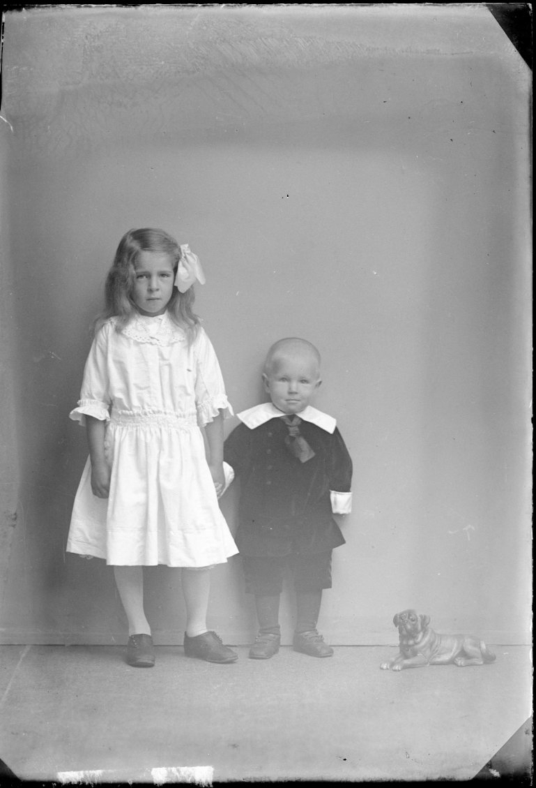 En flicka och en mindre pojke håller varandras hand. De är syskon. En leksakshund ligger på golvet intill dem.