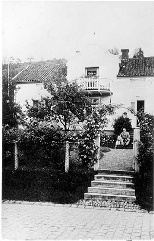 Bostaden på Brahegatan 66 från Brahegatan. Putsad byggnad med frontespis och balkong. Inhängnad tomt med staket och trappa upp från gatan. Grindstolpar med en rosenbåge. Längre upp på tomten sitter en man på trappan med en hund. Lite högre upp vid dörren sitter en kvinna med hatt. De är fastighetens ägare.