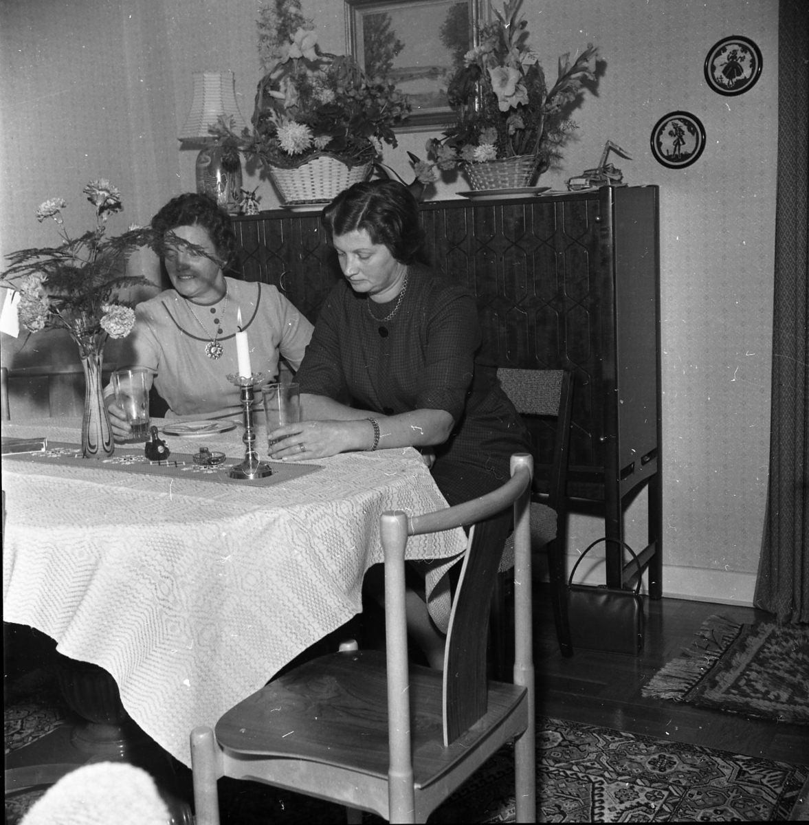 Två kvinnor sitter vid ett bord med glas i händera. Tända ljus och en blomsterbukett på bordet. Mer blommor på ett skåp bakom dem.