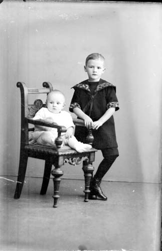 Ett spädbarn, en pojk, sitter i en liten stol. En äldre pojk står intill.